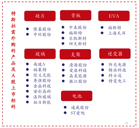(1)特斯拉光伏供应链:已知供应商:正泰电器(逆变器)、亚玛顿(玻璃)、南玻A(玻璃),及潜在供应商。