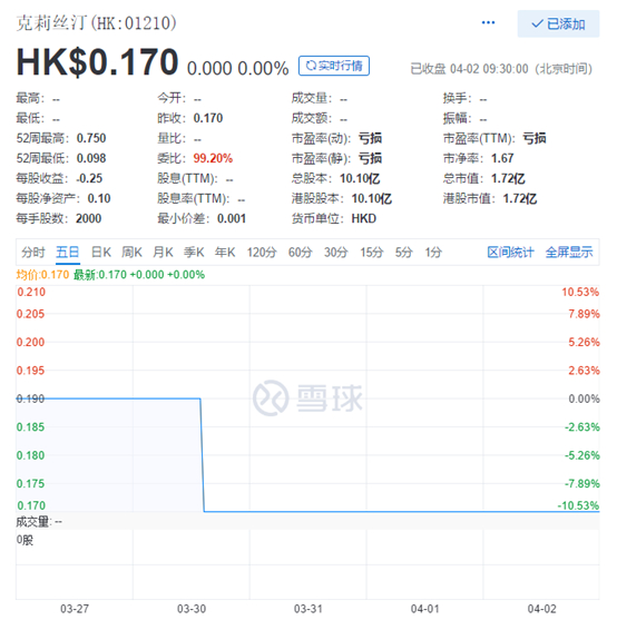 业绩报告发布后的第二日,蓝鲸财经记者发现,其在港交所的成交量已持续6日保持0记录,当下股价跌至0.17港元,总市值仅为1.72亿港元。