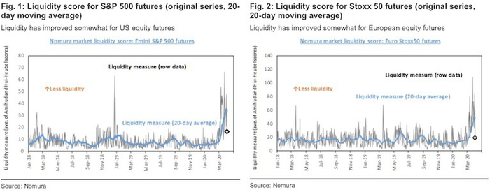 首先,欧美股指期货市场流动性复苏,实际交易显示,虽然流动性情况尚不稳定,但是日均流动性指标(Amihud和Hui-Heubel流动性指数均值)反映,流动性不足的情况有所改善。在通常情况下,交易流动性复苏会减少价格影响,压制过度的价格波动。同时,当前市场波动率下降,更有利于缓解此前投资者过度对冲的情况。当前,VIX已经从之前的70高位跌至40附近。