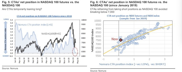 野村认为,CTA的做空策略可能已接近饱和。目前纳斯达克100期货反弹,而不是继续陷在7000以下的水平,因此推测CTA不再继续做空,而是开始跟踪纳斯达克100期货价格的上涨趋势,建立新的多仓 。