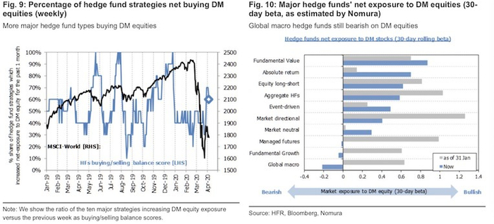 不过暂时可以确定的是,尽管市场情绪好转,当前的反弹仍仅限于技术性反弹。野村认为,重量级选手——全球宏观对冲基金和多空基金还未开始激进地布局。