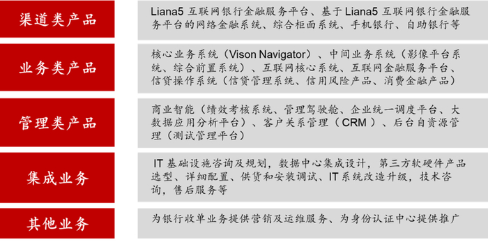 公司产品结构完整,传统业务稳定发展。公司拥有涵盖从渠道、业务到管理的完整产品线,以及包含系统集成、开发、测试、运维的服务。从产品结构看,公司在业务类产品方面,拥有在线金融、消费金融、网络贷款等优势产品;渠道类产品方面,由于业务属性相对较弱,与IT相关性较强,产品标准化程度相对较高利于提升盈利水平;管理类产品方面,公司在数据产品方面具有优势,拥有营销平台、CRM、ODS数据平台等多款产品。公司涵盖从数据、渠道到业务的完整产品线,有利于平滑收入的波动。