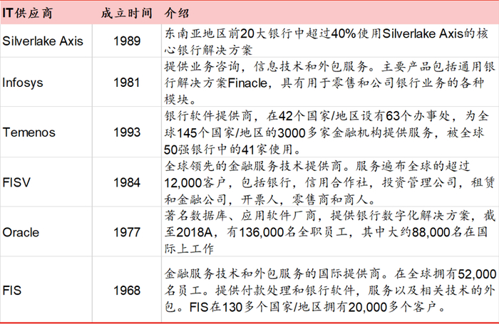 老牌金融IT供应商为主要竞争对手。公司在东南亚地区公司的主要竞争对手包括老牌金融IT厂商,包括Silverlake Axis,Fiserv,Oracle,infosys,fis,temenos等。此类厂商较早进入东南亚市场,进行银行核心系统的建设,并且已经形成了一定的收入规模。但由于东南亚金融IT市场的快速发展,对互联网银行等新兴业务的需求不断提升,老牌厂商的市场地位将受到一定冲击,因此近年来老牌厂商也通过收购增强自己的数字银行解决方案实力。