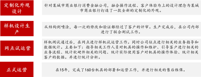 具有丰富运营经验,有力支撑创新业务开展。公司多年来已在软,硬件开发中积累了一定的经验和技术,开发并形成了一系列对公,对私自助设备产品,其中包括:自助票据机(ADM)、自助视频贷款机(VCM)、超级柜台(STM)、印控机等,并且在实施过程中积累了丰富的运营经验,能够有力支撑创新业务的开展。