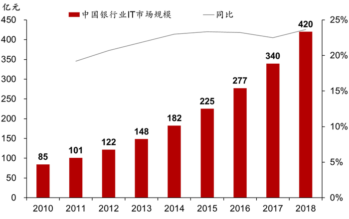 银行IT行业整体增速稳定。我国银行IT行业整体呈现稳定增长的态势,根据IDC数据,2012-2018年,我国银行IT行业增速基本稳定在20%-25%之间,略高于IDC过去的预测值。据IDC最新的中国银行业IT解决方案市场报告,2018年我国银行业IT解决方案市场规模达到419.9亿元,预计2019- 2022年CAGR为20.8% 到2022年中国银行业IT解决方案市场规模将达到882.95亿元,我国银行IT行业有望保持稳定增长的态势。