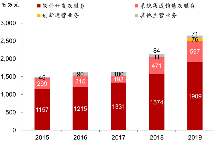 收入以软件开发及服务为主,盈利能力行业领先。从收入结构看目前的主营业务包括软件开发及服务、系统集成、其他主营业务。近年来公司软件开发及服务业务稳定增长,占总收入比始终保持在70%以上,系统集成业务则受波动较大。盈利能力方面,受行业整体利润水平下降及公司出于战略考虑承揽部分低毛利集成项目的影响,公司的盈利水平2018年有所下滑,但仍然高于行业平均水平。