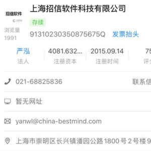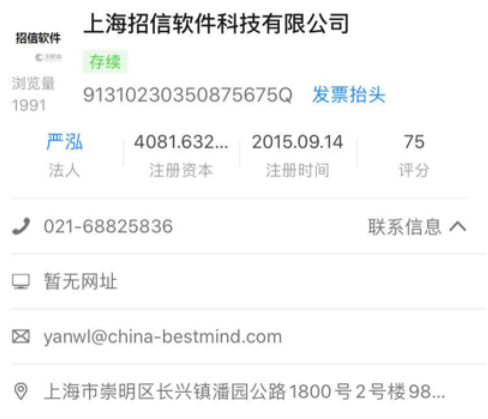 同时,上海招信工商信息中留的邮箱后缀为@china-bestmind.com,其背后穿透的是上海北溟信息科技有限公司。
