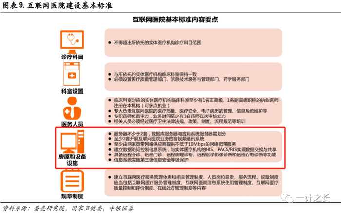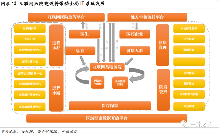 分为平台建设+运营两大市场。互联网医院依然依托于当前的实体医院,信息化投入规模主要分两大部分,第一步是互联网医院平台建设,类似于医院信息化项目建设,将包含远程医疗中心及数据打通环节不断完善;第二步是诊疗运营,包含线上医生资源匹配、处方流转、线下医药配送等环节。