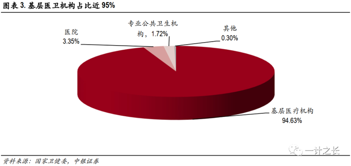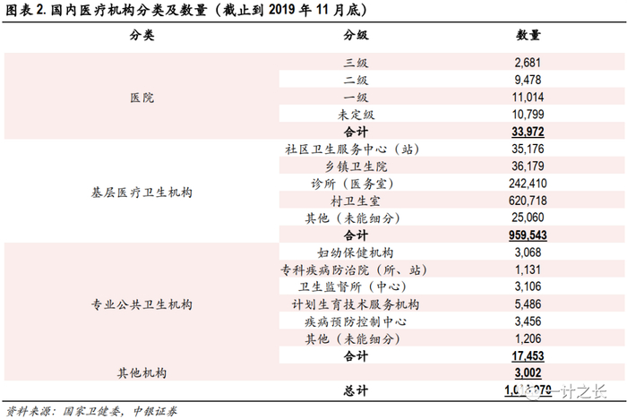 根据国家卫健委数据,2019年11月底国内共有医疗机构101.4万家,相较同期总数的100.4万家增加近1万家(其中医院增加1,496、基层医卫机构增加9,560、专业公共卫生机构减少1,788家),基层医卫机构是下沉市场的主力。
