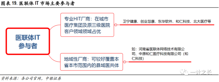 在县域医共体领域,以河南省为例,2019年工作重点将是逐步构建“县乡村”一体化管理体制,那么每个县级市的医联体主导权将得到强化,因此组建的地域性医联体专业建设公司和传统的HIT厂商形成竞合关系,其中河南省中原资产管理公司与和仁科技共同成立智慧医疗合资公司,共同开拓全省县域市场,具体分工为中原资产负责市场及商务拓展,和仁负责技术产品方案提供县域云医疗平台方案。