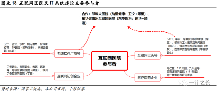 重点分析两大类参与主体。医疗信息化行业主要有两大类参与主体:传统的HIT厂商和互联网公司。传统HIT龙头企业包括卫宁健康、创业慧康、东华软件、医惠科技、万达信息等老牌软件厂商,互联网医疗厂商如阿里健康(阿里系)、平安好医生(平安系)等企业深度参与到蓝海市场,并形成了一定的护城河。
