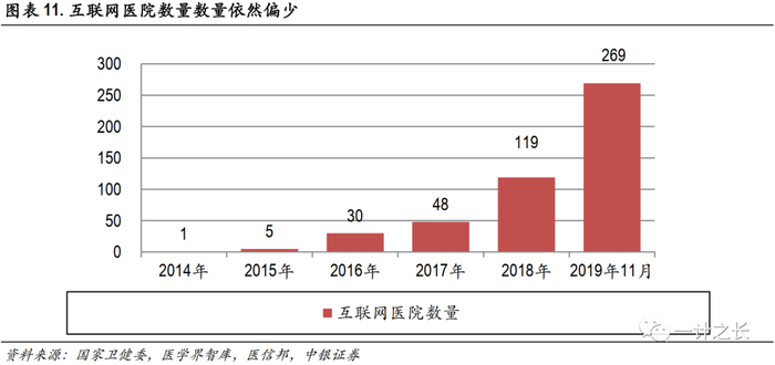 三级医院互联网医院化率仅10%,未来增长弹性将是数倍。根据国家卫健委发布《关于促进“互联网+医疗健康”发展情况的报告》,截至2019年11月底全国已有269家互联网医院,“互联网+医疗健康”的政策体系基本建立。同时全国已有19个省份依托互联网或专网建成省统一规划的远程医疗网络平台,实现异地就医定点医疗机构查询共享服务。2019年11月底全国共有2681家三级医院,互联网医院占三级医院比例仅为10%。同时国家卫健委表示下一步将着力推动实现二级以上医院普遍提供线上服务,三级医院实现院内信息互通共享等“硬任务”,同时指导各地加快“互联网+医疗健康”监管平台建设。根据现状数据和政策发力重点领域进行对比,可以发现互联网医院建设提升空间巨大。根据易观发布的《中国医院互联网化专题研究报告2017》预测,未来五年医院互联网化率有望提升到80%,未来10年互联网将成为医疗机构的基础设施,全面重塑就诊全程,改善患者的就医体验。综合以上数据可见,未来互联网医院增长的弹性将是数倍。