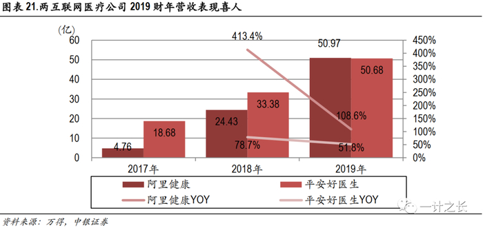 阿里健康:背靠阿里平台,医药电商进军医疗。阿里健康是阿里系在互联网医疗健康板块的重要布局,公司背靠阿里平台,由医药电商业务带动整体营收快速增长,2019财年营收和毛利分别是50.9和13.3亿,同增108.6%和103.9%,医药电商占比超96%,增速为106.3%。