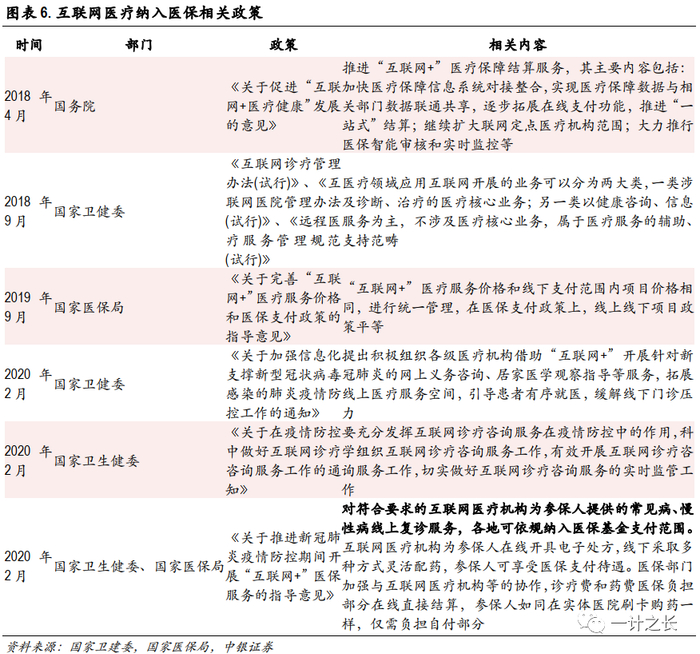 例如,自2018年4到今年2月疫情期间,医保支付关于互联网网医院放松政策一直在加码。2020年2月28号,国家卫健委发文要求,将符合条件的“互联网+”医疗服务费用纳入医保支付范围,经卫生健康行政部门批准设置互联网医院或批准开展互联网诊疗活动的医疗保障定点医疗机构,按照自愿原则,与统筹地区医保经办机构签订补充协议后,其为参保人员提供的常见病、慢性病“互联网+”复诊服务可纳入医保基金支付范围。目前如武汉、上海、浙江等省市已经出台政策规定实行,预期今年上半年各地卫健委和医保局部门会出台政策文件,将辖区内的互联网医院服务纳入医保支付。