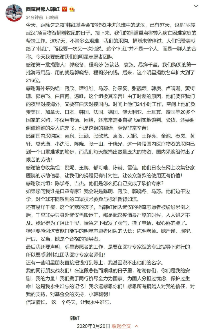 3月20日,韩红在微博发出长文,细数了曾与她一同并肩作战的明星志愿者团队