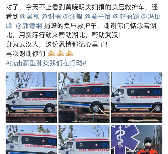 2月9日,吴京谢楠捐赠的负压救护车被网友发现,此外还有汪峰章子怡、冯绍峰赵丽颖及郭德纲捐赠的救护车一并被网友偶遇