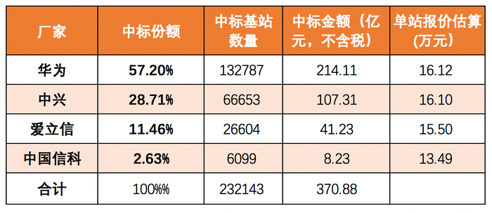 按照一个基站3个扇区,每小区一个载波计算,相当于每个4G基站的采购价格为10至19万元之间。根据各厂家份额比例和报价估算,当时平均每个4G基站的采购价格不到12万元。