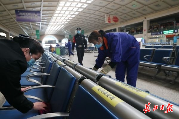 4月6日,武汉铁路公安处汉口车站派出所民警和铁路工作人员在全面检查车站,车站保洁人员在逐个清理座椅卫生,为汉口火车站全面重启作准备。通讯员胡金力供图