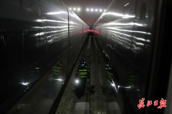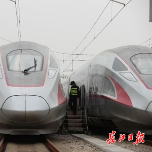 4月6日,武汉动车段,武汉铁路公安处民警正在巡逻开展安全检查,24小时守护高铁动车组安全。通讯员胡金力供图