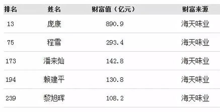 董事长庞康以890.9亿身价位列总榜单的第13位,超越大家所熟知的 新希望 刘永好家族(714.2亿)、达利许世辉家族(622.2亿)、娃哈哈宗庆后(579.8亿)等食业富豪。富有“造富工厂”之称的海天味业没有让合伙人失望,程雪、潘来灿等多名高管财富实现飙升。