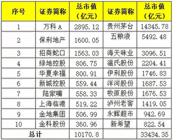 (十大地产上市企业总市值排名与十大食品消费上市企业总市值排名对比)