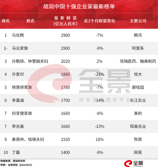 在疫情冲击下,中国的前十大富豪出现了变化。据胡润研究报告显示,马化腾首次成为中国首富,财富达到2900亿元,与马云并列首富。
