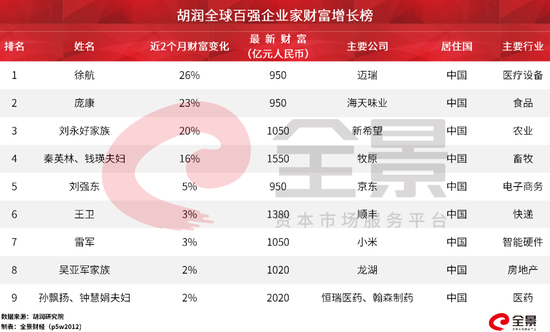 而相比海外的首富们,中国百强企业家们的财富则较为坚挺。据胡润研究报告显示,2020年2-3月份,全球有9位百强企业家的财富出现了逆势增长,全部来自中国:
