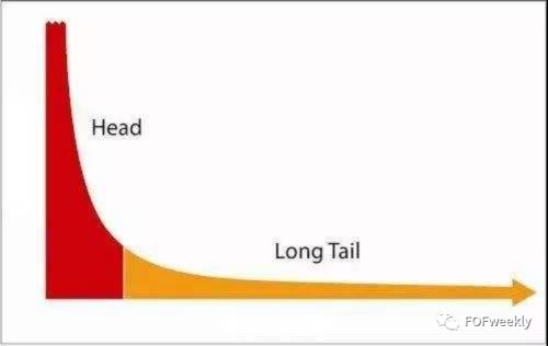 VC基金的回报具有“幂律分布(Power-Law Distribution)”的特征。提到“幂律分布”,可能很多人第一反应就是“长尾效应”,长尾效应是Chris Anderson在其2006年出版的畅销书The Long Tail一书中提到的洞见。Chris Anderson认为,大量非主流、个性化的需求会在需求曲线上面形成一条长长的“尾巴”,而所谓长尾效应就体现在其庞大的总计数量上-将所有非主流市场的需求累加起来,就会形成一个远大于主流市场的巨大市场,只要有办法将这些长尾客户的获取和交付成本降下来,就有机会获得巨大的利润。在互联网时代,利用长尾效应而一举成为行业巨头的例子不胜枚举如。这条著名的“长尾效应”幂律分布曲线图如下所示: