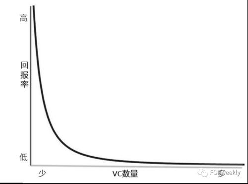 在上面的示意图中,纵坐标表示回报率(仅为示意图,不代表实际回报率),横坐标表示VC基金管理人的数量。从上图中不难看出,获得高回报率的VC基金数量极少,大多数长尾VC基金的回报率其实很低(或者亏损)。