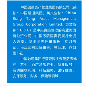 目前,对于中国融通的描述,仅有其官方微信号披露的两段话:中国融通集团为中央直接管理的商业类独资企业,主要经营范围主要包括房地产、农业、酒店及旅游业、商业服务、资源回收利用、科技服务、医疗健康、安保服务、财务、保险等领域。