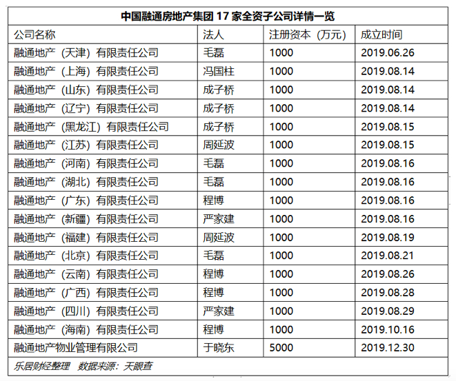 不过巧合的是,一家名为中国融通房地产集团有限公司于近期悄然成立。尽管在天眼查上,它的工商信息几乎空白,但可以查询到的是,在2019年8月后,该公司密集成立了17家全资控股子公司(仅一家显示注册时间为7月前),前缀均冠以“融通地产”的字样。