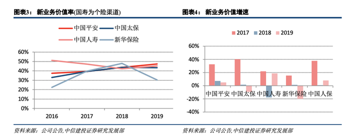 首先看几家上市险企人身险保费收入增速情况,中国平安、中国太保增速相较去年有所下降,同比分别增长 7.2%、5%,中国人寿、新华保险、中国人保同比增速较去年有所提升,分别增长 5.8%、13%、11%。个险新单保费增长情况与保费增长趋势一致,中国人寿新单保费增速大幅度超同业,转负为正同比+9.4%,新华新单同比小幅正增长,平安和太保下滑幅度继续加大。其次,新业务价值率方面,除了新华保险有大幅度的下降,从47.9%下降至 30.3%,其他险企基本持平或有所提升,中国太保 43.3%(43.7%)、中国平安 47.3%(43.7%)、中国人寿个险渠道新业务价值率 45.3%(42.2%)(括号内为 2018 年同期对比数据)。传导到新业务价值上,中国人寿和中国人保同比改善明显,分别增长 18.6%、7.9%,二者都是保费与价值率双重提升,而平安新单保费下降但是价值率提升,新业务价值仍然正增长 5.1%,太保新单保费负增长拖累新业务价值负增长 9.3%,新华新单虽有提高,但产品结构及渠道结构的调整拉低新单价值率导致新业务价值负增长 19.9%。新单数量与质量共同决定了新业务价值,两者出现反向变动时,需要达到一定的平衡才能对冲掉对价值的影响。