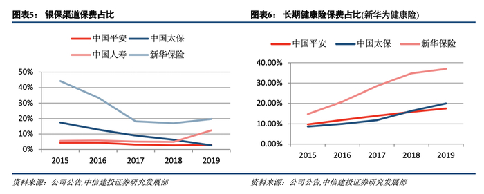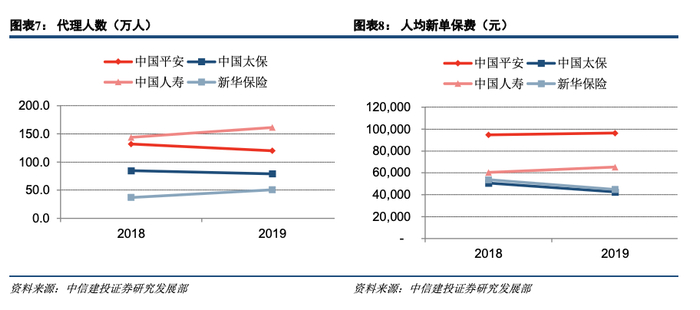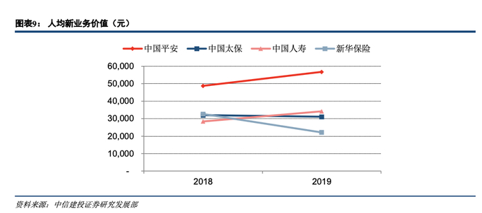 过去依靠队伍规模拉动业绩增长的模式边际效益下降,800万代理人已走到了分岔路口,寿险行业已经步入以高质量发展为主线的新周期。从代理人规模上看,国寿、新华高增长,平安、太保有削减;我们用人均新单保费和人均新业务价值来衡量代理人质量是否有改善,两个指标均有所提升的是中国平安和中国人寿,人均新单保费中国平安+1.8%、中国人寿+8.2%,人均新业务价值中国平安+16.4%,中国人寿+20.4%。个险渠道的新业务价值率,2019 年平安已经达到 64.9%,比国寿高 11.6 个百分点,是新华的 2 倍。所以在代理人质量提升方面,平安和国寿已经看到成效,且平安已经和其他几家公司拉开了明显差距,太保和新华还在提高的路上。