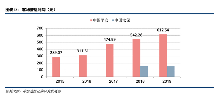 在客户的维护与开发方面,中国平安是险企中走在前列的,最开始提出生态圈的建设,实际上就是在加强客户的运营管理,增强客户在平安体系内的留存与消费。平安坚持强调以客户为中心,深耕个人客户,基于“一个客户、多种产品、一站式服务”的客户经营理念,围绕五大生态圈,为客户提供更丰富的产品与更优质的服务。平安也是较早就提出“客均”的概念,当前仅平安和太保强调并披露了客均数据,2019 年客均合同数中国平安为 2.64、中国太保为 1.95,客均营运利润中国平安为 612.54 元,中国太保为 160 元。从绝对值上来看,客均的数值可能并不高,但从趋势上来看,客均合同数和客均利润呈现逐年增长的良好态势,可以预见的是未来存量客户将是利润贡献的重要来源,是保险公司实现持续自我成长的重要因素。