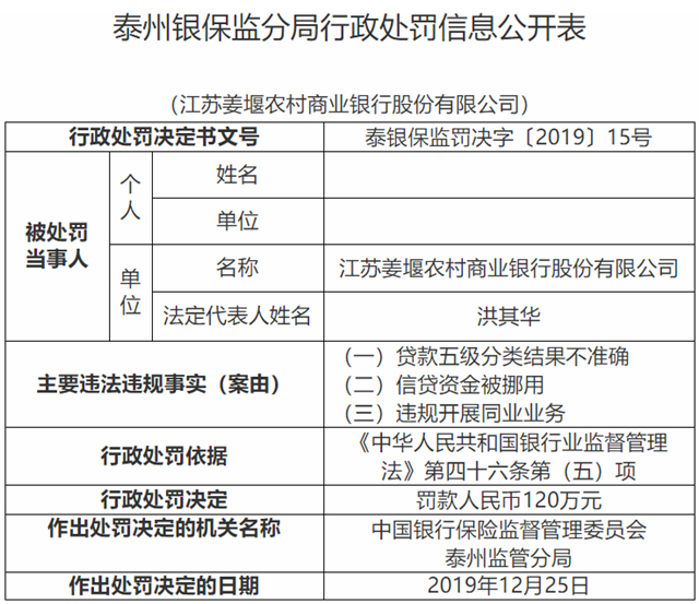 中国经济网北京4月8日讯 银保监会网站昨日公布的泰州银保监分局行政处罚信息公开表(泰银保监罚决字〔2019〕15号)显示,江苏姜堰农村商业银行股份有限公司(以下简称“江苏姜堰农商行”)存在贷款五级分类结果不准确、信贷资金被挪用、违规开展同业业务三宗违法违规行为。根据《中华人民共和国银行业监督管理法》第四十六条第(五)项,中国银行保险监督管理委员会泰州监管分局对其处以罚款人民币120万元。