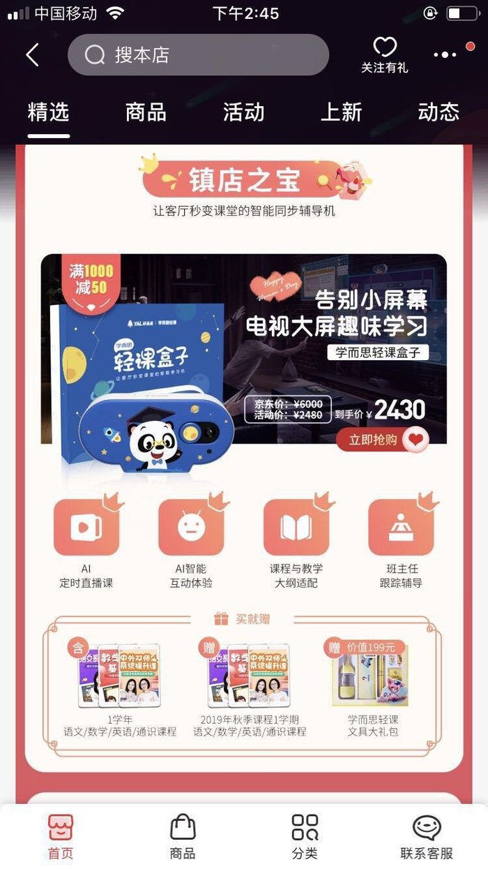 而在京东等平台学而思轻课的官方旗舰店中,这个品牌主要销售3大类产品。其中,“镇店之宝”为轻课盒子。该产品是学而思轻课2019年刚发布的一款专注于3-12岁小朋友家庭客厅学习场景的智能学习机,它可以连到4K大屏用于让孩子学习课程,其售价也在学而思轻课官方旗舰店中最高,最高达2480元。此外两类产品分别为学而思轻课VIP会员卡和学而思轻课课程,售价在19.9元-399元不等。