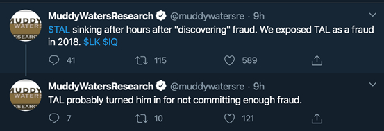 好未来自曝员工造假业绩后,知名做空机构浑水(Muddy Waters Research)在推特上发布信息称,“$TAL在‘发现’欺诈几小时后股价下跌。我们在 2018 年就将好未来(TAL)列为欺诈。”