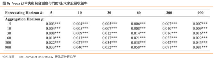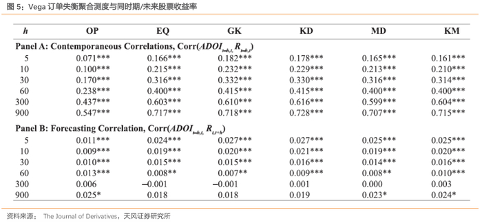 下表的Panel A展示了Vega订单失衡度量和同一时间段内股票收益波动率之间的同期相关性估计。同时期相关性估计值远小于股票收益率和股票订单失衡之间的相关性估计值。短期内,估计值几乎为零。只有在超过一分钟的时间窗口中,我们才能观察到不同Vega订单失衡度量之间的显著且一致的相关性估计。