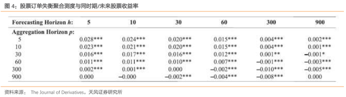 图表3的Panel B展示了Delta订单失衡度量和股票未来回报之间的预测相关性。正如预期,预测相关性远低于同期相关性估计。此外,与同时期相关性不同,时间窗口越短,预测相关估计越显著。估计值随着时间窗口的增加而下降,当时间窗口超过一分钟时,大多数估计值在统计学上变得不显著。同样,Strike Discount(KD)方法下的Delta订单失衡度量对股票未来收益预测的相关性最高。下图展现了Strike Discount(KD)方法下在不同的预测区间和聚合时间窗口下的相关性结果。估计结果表明,当聚集期和预测期都较短时,预测能力最强。可预测性随聚集期或预测期的增加而迅速下降。这一发现表明,有关股票价格变动的信息消散得非常快。
