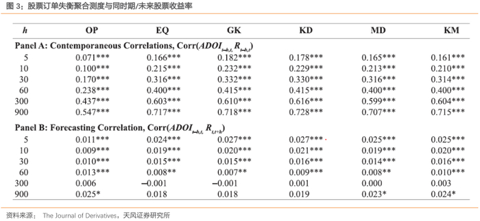 为了衡量不同的订单失衡聚合测度的有效性,我们测量了订单失衡聚合测度与股票收益和收益波动在不同提前和延后水平上的相关性。