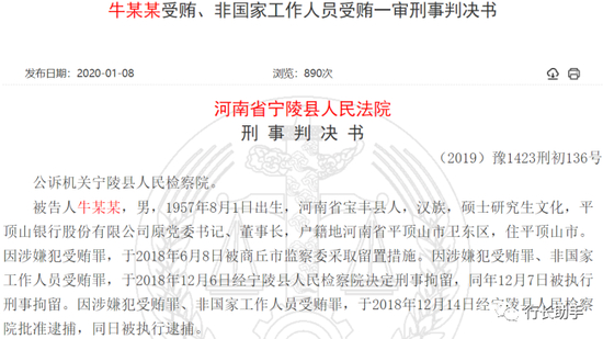 记者经梳理发现,2018年6月,牛君彬被商丘市监察委采取留置措施,针对牛君彬的调查就此拉开大幕。经过半年的审查,2018年12月6日,宁陵县人民检察院决定对牛君彬刑事拘留,并于同年12月14日逮捕牛君彬。至2019年10月,宁陵县人民法院对牛君彬作出一审判决。