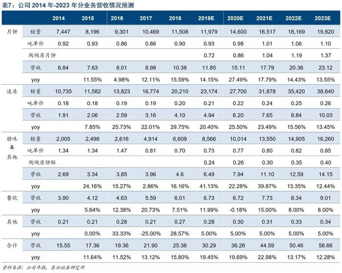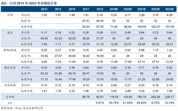 产量释放支撑业绩增长,市值三年看翻倍。考虑到未来三年新增生产基地产能将陆续落地,经测算,月饼/速冻/腊味&其他业务2019-2021年营业收入预计分别累积增长71.4%/86.6%/141.4%,未来三年市值有翻倍空间。