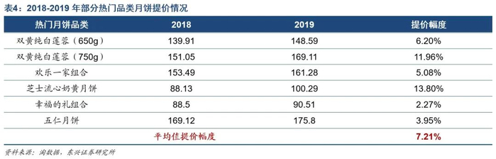 成本驱动定价策略,价格涨势更显温和。公司月饼系同品类产品提价决策为成本驱动型,主要参考原材料成本和竞争对手情况定价。剔除成本整体上涨幅度有限,我们参考了月饼销售旺季期间(7月-8月),天猫广州酒家品牌旗舰店月饼产品销售数据,发现2018年-2019年特定热门月饼品类的平均提价幅度为7.21%。