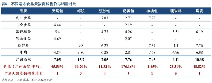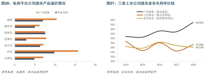 品牌力带来高毛利,速冻定价平均高于市场50%。强品牌力支撑下,公司已有速冻产品相对同业具备一定溢价能力,叠加公司速冻业务主要面向C端客户,因此同品类产品价格普遍高于同业均价。我们自各品牌天猫旗舰店取7种典型的广点作为样本,发现广州酒家的速冻产品相对于同业的溢价空间平均超过50%,与此同时天猫线上销售量排名均位于前列。受益近年来公司速冻产量攀升,规模效益逐渐显现,公司毛利率呈现波动上升的趋势,品牌溢价下的毛利率水平高于三全食品、安井食品同类业务毛利率约10pct.,盈利水平显著高于同业。