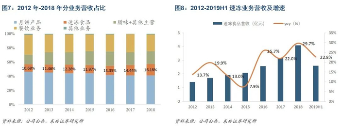 以食品制造为核心,以餐饮业务创品牌。食品制造业务中的月饼系列产品是公司业务核心,占公司营收在40%以上;速冻系列产品为现阶段公司重点发展的常态化产品,近年增长较快,2018年营收占比为16.18%,未来速冻业务的目标营收占比50%;其他业务包括腊味、饼酥、菜式、粽子等等,属于培育型业务,腊味和饼酥产品的年营收都在亿元以上,规模渐起。公司食品制造业务在广州、湘潭、梅州、茂名多地拥有多个已投入或在建食品生产基地,同时拥有超200家饼屋(含加盟店)的全渠道销售体系。餐饮方面,“广州酒家”是公司拥有的核心餐饮品牌,身处全国餐饮竞争最为激烈的美食之都,凭借80余年品牌美誉度积淀,成为“食在广州第一家”的本地城市名片。目前公司拥有19家直营店。