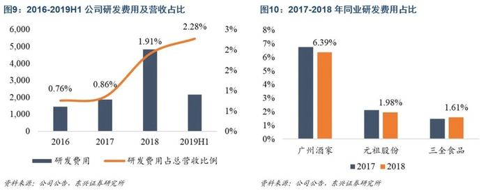 高度重视研发创新,研发投入高于同业。作为广式月饼领域的龙头企业,不断提升公司食品制造产品及餐饮菜式研发与革新能力,是公司适应市场激烈竞争的核心武器。公司长期重视研发投入,从2016年的1465.13万元增至2018年的4847.24万元,研发费用绝对值以及占总营收比例均在近年来显著提升。截止2018年,公司拥有研发人员289人,占公司总人数的6.39%,(元祖1.98%/三全食品1.61%),研发工作重视程度高于行业平均水平。公司不仅持续布局自身研究工作,同时不断加大与高校、科研等第三方机构的合作,深入产学研究,2018年公司科技项目立项17个,涵盖公司食品制造与餐饮业务,其中,防腐抗酸败广式月饼、液态蛋糕点、控糖健康糕点、低脂莲蓉月饼等产品获得2018年度高新产品认定。