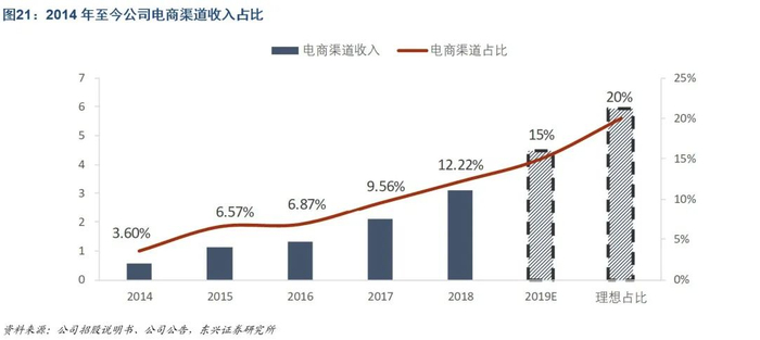 电商增量成为渠道端新亮点。随着互联网购物习惯进一步普及,需求端在公司知名度提升背景下不断放量,而供给端能力随募投项目电商平台扩建和 公司对电商平台的扶持而不断加强,公司食品制造业务电商渠道营收占比已从2014年的3.6%增长至2019年H1的15%。电商渠道规模稳定增长,未来公司食品业务电商渠道的目标占比希望稳定在20%左右,将成为公司全渠道销售体系的重要支撑之一。