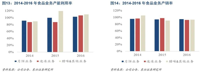 强品牌力造就高产销率,产能瓶颈制约销售规模。公司以月饼产品为代表的食品享有较高的品牌知名度和影响力,产品产销率维持在较高水平,但产能水平一直以来制约着公司月饼销量。2016年公司食品制造业务产能利用率均超过了100%,在公司产品保持着高市场接受度背景下,产能问题成为了直接制约公司业务规模继续增长的实质障碍。