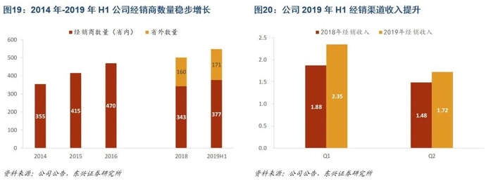 把控直营模式开店成本,经销收入份额渐升。考虑到购置物业成本、租金成本、人工成本逐年提高,为降低投资风险,公司相应提升了对直营门店的开业标准。2019年3月,公司公告称变更部分募投项目,其中包括食品零售网络项目,将原计划在广东省内五地建设的230家直营店(购置+租赁)调整为在广州、佛山建设80家直营店(均为租赁),有效提升募投资金使用价值。直营模式成本抬升背景下,公司着力发展经销模式渠道,2014年-2018年CAGR为9.64%,截止2019年6月底,公司拥有558家经销商(其中省内经销商占比67.56%),经销网络在全国范围内铺开,为公司开拓省外市场提供有力支撑。2019年公司经销渠道收入在Q1/Q2分别同比增长25.27%/16.53%,经销渠道布局效果初显,预计在包含月饼销售旺季的下半年同样能为公司贡献营收增量。
