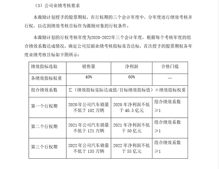 3月14日,长城汽车发布了《2020 年限制性股票与股票期权激励计划(草案一次修订稿)摘要公告》,在该草案中,激励计划行权指标之一是2020年会计年度销量不低于102万辆,净利润不低于40.5亿元,这两个“考核指标”均低于2019年度水平。